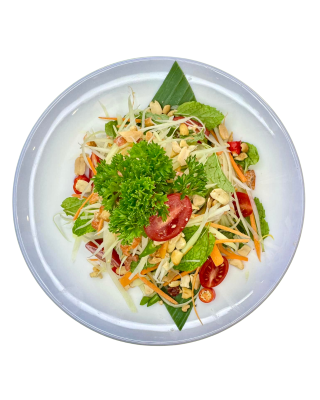 Gỏi đu đủ tôm khô là sự kết hợp giữa đu đủ xanh bào sợi giòn tươi, tôm khô đậm đà, cà chua bi mọng nước, đậu đũa, ớt tươi và nước cốt chanh. Tất cả được trộn đều cùng nước mắm Thái pha với đường thốt nốt và nước me, tạo nên một hỗn hợp nước sốt chua cay mặn ngọt hài hòa – đúng chuẩn “vị Thái”.